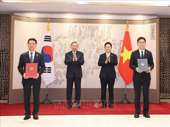 Sáng 11/8/2025, sau hội đàm tại Phủ Tổng thống Hàn Quốc Yongsan ở thủ đô Seoul, Tổng Bí thư Tô Lâm và Tổng thống Hàn Quốc Lee Jae Myung chứng kiến lễ trao các văn kiện hợp tác giữa hai nước.