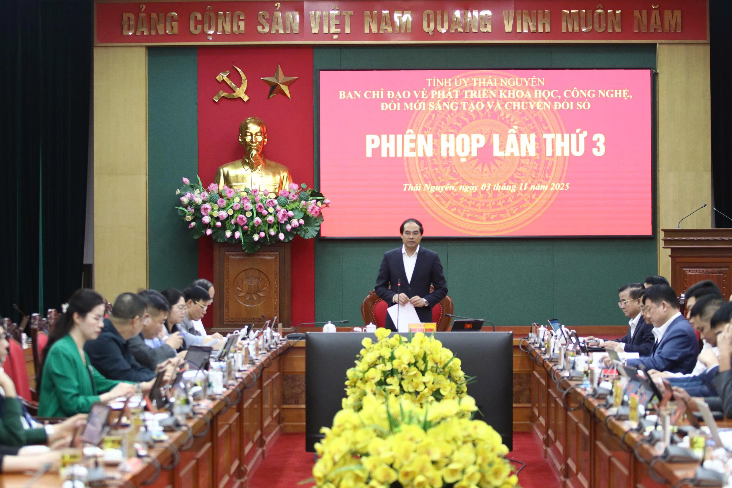 Ngày 03/11, Ban Chỉ đạo Phát triển khoa học, công nghệ, đổi mới sáng tạo và chuyển đổi số tỉnh Thái Nguyên đã tổ chức Phiên họp lần thứ 3 nhằm đánh giá kết quả triển khai Nghị quyết số 57 dưới sự chủ trì của đồng chí Trịnh Xuân Trường, Bí thư Tỉnh ủy, Trưởng Ban Chỉ đạo. Cùng dự có đồng chí Nguyễn Đăng Bình, Phó Bí thư Thường trực Tỉnh ủy, Chủ tịch HĐND tỉnh và đồng chí Nguyễn Thanh Bình, Phó Bí thư Tỉnh ủy, Phó Chủ tịch Thường trực UBND tỉnh, cùng các đồng chí Ủy viên Ban Thường vụ Tỉnh ủy, thành viên Ban Chỉ đạo.